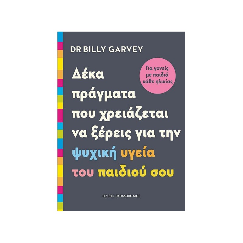 Ο Δρ Μπίλι Γκάρβεϊ, διακεκριμένος αναπτυξιολόγος με πολυετή εμπειρία, προσφέρει σε αυτό το βιβλίο μια πρακτική και ουσιαστική καθοδήγηση για γονείς που θέλουν να στηρίξουν την ψυχική υγεία των παιδιών τους. Μέσα από απλή γλώσσα και επιστημονικά τεκμηριωμένες συμβουλές, ο συγγραφέας εξηγεί πώς μπορούμε να αναγνωρίζουμε και να αντιμετωπίζουμε ζητήματα όπως το άγχος, η κατάθλιψη και η χαμηλή αυτοεκτίμηση. Παράλληλα, δίνει έμφαση στη συναισθηματική σύνδεση και την ενσυναίσθηση, προσφέροντας εργαλεία για την καλλιέργεια αυτοπεποίθησης και ανθεκτικότητας στα παιδιά. Ένα βιβλίο-οδηγός για κάθε γονιό που επιθυμεί να βοηθήσει το παιδί του να αναπτυχθεί με ισορροπία, κατανόηση και δύναμη.
