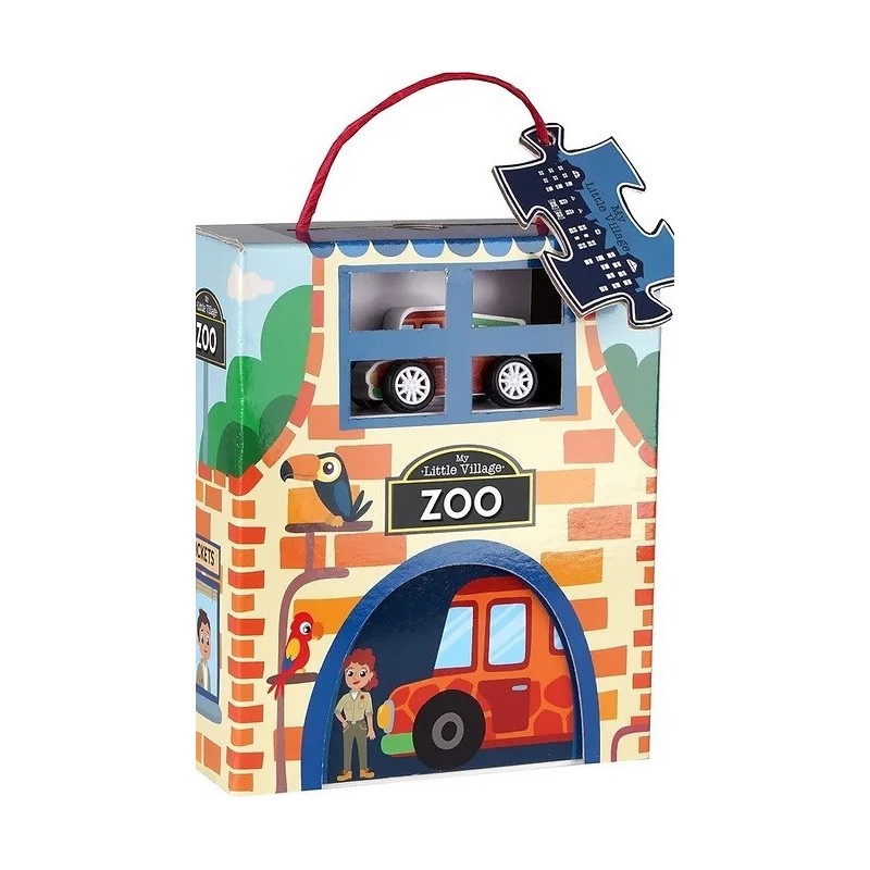 Περιεχόμενο κουτιού: Ένα βιβλίο 16 σελίδων από χαρτόνι με πληροφορίες για τα ζώα και την καθημερινότητα στον ζωολογικό κήπο. - Ένα ξύλινο τζιπ ζωολογικού κήπου εξαιρετικής ποιότητας. - 4 φιγούρες από χαρτόνι. - Ένα κουτί που μεταμορφώνεται σε ζωολογικό κήπο. - Παζλ με 16 κομμάτια που σχηματίζει την πόλη γύρω από τον ζωολογικό κήπο. - Παιχνίδι τα