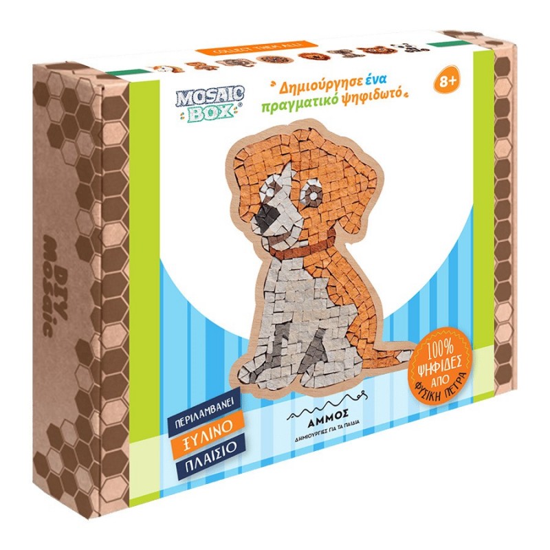 Η ΑΜΜΟΣ συνεχίζει την ελληνική παράδοση της χειροτεχνίας, με Ψηφιδωτά Παιχνίδια για παιδιά, από 8 ετών. Το MOSAICBOX περιλαμβάνει 100% φυσικές πέτρες υψηλής ποιότητας, κομμένες από πραγματικούς καλλιτέχνες ψηφιδωτού στην Τυνησία.