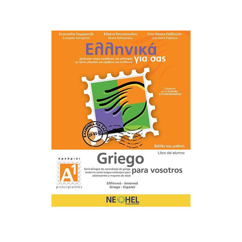 Το βιβλίο του μαθητή Ελληνικά για σας Α1 ανήκει στη δίγλωσση σειρά εκμάθησης της ελληνικής ως ξένης γλώσσας Ελληνικά για σας, η οποία απευθύνεται σε εφήβους και ενηλίκους. Πρόκειται για ένα δίγλωσσο υλικό, το οποίο διευκολύνει τη διδασκαλία στην τάξη, αλλά και την αυτόνομη μάθηση. Το Βιβλίο του μαθητή Α1 περιλαμβάνει υλικό σύμφωνο με το Κοινό Ευρωπαϊκό Πλαίσιο Αναφοράς για τη Γλώσσα (ΚΕΠΑ) και με την ύλη που απαιτείται για την απόκτηση του Πιστοποιητικού Ελληνομάθειας Α1 του Κ.Ε.Γ. (Κέντρο Ελληνικής Γλώσσας). Για τη δημιουργία του εκπαιδευτικού υλικού Ελληνικά για σας Α1 συνδυάστηκαν ποικίλες διδακτικές προσεγγίσεις, με κυρίαρχη βεβαίως την επικοινωνιακή. Το Βιβλίο του μαθητή Α1 συμπληρώνεται από το Τετράδιο ασκήσεων Α1 (ηχητικό υλικό 4 ωρών, CD mp3) και διαδραστικό ψηφιακό υλικό (DVD-Rom). Επιπλέον, στις ιστοσελίδες της NEOHEL υπάρχουν οι λύσεις του τετραδίου ασκήσεων, το Βιβλίο του δασκάλου και μια σειρά τεστ για τις εξετάσεις Ελληνομάθειας (www.neohel.gr). Οι συμπληρωματικές ασκήσεις e-learning βρίσκονται (www.greekforyou.eu). ΛΕΞΙΛΟΓΙΟ 2.500 λέξεις ΕΠΙΚΟΙΝΩΝΙΑ 92 Στόχοι ΓΡΑΜΜΑΤΙΚΗ 104 Φαινόμενα ΔΙΔΑΚΤΕΑ ΥΛΗ & ΩΡΕΣ ΔΙΔΑΣΚΑΛΙΑΣ Βασική ύλη (Βιβλίο + Τετράδιο ασκήσεων + Λύσεις): 25 κεφάλαια (149 κείμενα, 25 τραγούδια, 750 ασκήσεις) Ώρες διδασκαλίας: 130-140 Συμπληρωματική ύλη: 70 κείμενα για ανάγνωση & κείμενα πολιτισμού Ώρες διδασκαλίας: 40-50 Η ΔΙΓΛΩΣΣΙΑ Η διγλωσσία αφορά τις εκφωνήσεις των ασκήσεων, τους κανόνες γραμματικής, το λεξιλόγιο, τις εκφράσεις και τους ιδιωτισμούς της ελληνικής γλώσσας, στοιχεία κοινωνιογλωσσικά, πολιτιστικά και καθημερινής ζωής. Το υλικό μπορεί να διδαχθεί και σε μία διαπολιτισμική τάξη στην οποία κάθε μαθητής θα έχει το βιβλίο με τη γλώσσα αναφοράς που θα επιλέξει, χωρίς να είναι απαραίτητο ο διδάσκων να γνωρίζει καμία από τις γλώσσες αναφοράς.