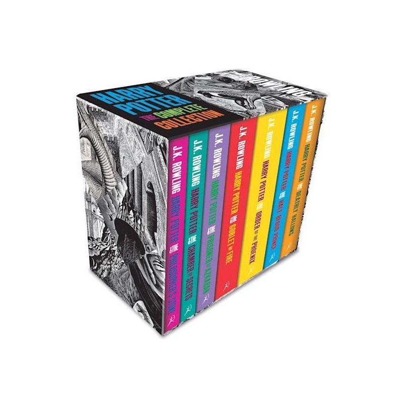 These adult editions of J.K. Rowling\'s Harry Potter novels have been stylishly redesigned to showcase beautiful jackets by renowned woodcut artist Andrew Davidson. This spectacular box set includes all seven novels and is perfect for Harry Potter novices and collectors alike. Contains (in reading order): Harry Potter and the Philosopher\'s Stone, Harry Potter and the Chamber of Secrets, Harry Potter and the Prisoner of Azkaban, Harry Potter and the Goblet of Fire, Harry Potter and the Order of the Phoenix, Harry Potter and the Half-Blood Prince, and Harry Potter and the Deathly Hallows.