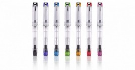 The Pilot Prera fountain pen has a transparent body with colorful accents