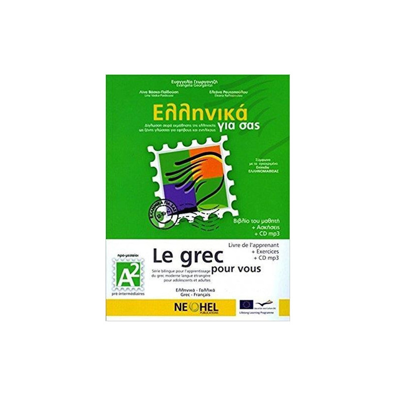 Το βιβλίο του μαθητή "Ελληνικά για σας Α2" ανήκει στη δίγλωσση σειρά εκμάθησης της ελληνικής ως ξένης γλώσσας Ελληνικά για σας, η οποία απευθύνεται σε εφήβους και ενηλίκους. Πρόκειται για ένα δίγλωσσο υλικό, το οποίο διευκολύνει τη διδασκαλία στην τάξη, αλλά και την αυτόνομη μάθηση. Η σειρά Ελληνικά για Σας απευθύνεται σε: 1. Φοιτητές σε πανεπιστήμια εξωτερικού, 2. Μαθητές της δευτεροβάθμιας εκπαίδευσης, 3. Σπουδαστές ενήλικες σε σχολές διά βίου μάθησης, στην Ελλάδα και στο εξωτερικό, 4. Μετανάστες στη χώρα υποδοχής (Ελλάδα), 5. Παλιννοστούντες Έλληνες, 6. Έλληνες δεύτερης, τρίτης κ.λπ. γενιάς στο εξωτερικό. Το Βιβλίο του μαθητή Α2 περιλαμβάνει υλικό σύμφωνο με το Κοινό Ευρωπαϊκό Πλαίσιο Αναφοράς για τη Γλώσσα (ΚΕΠΑΓ) και με την ύλη που απαιτείται για την απόκτηση του Πιστοποιητικού Ελληνομάθειας Α2 του Κ.Ε.Γ. (Κέντρο Ελληνικής Γλώσσας). Περιέχει: - 308 κείμενα* + 500 ασκήσεις (κατανόησης και παραγωγής προφορικού / γραπτού λόγου, λεξιλογίου & γραμματικής) - 13 τεστ ελληνομάθειας (Ένα στο τέλος κάθε κεφαλαίου) - 14 τραγούδια (Βλέπε: www.neohel.com YouTube) - Λεξιλόγιο 2225 λέξεων και εκφράσεων μεταφρασμένων στη γλώσσα στήριξης (α. Συνολικό αλφαβητικό λεξιλόγιο στο Παράρτημα 2, β. Λεξιλόγιο ανά κεφάλαιο, γ. Θεματικά λεξιλόγια) - Συνοπτικούς πίνακες γραμματικής (στο Παράρτημα 3) - 3 κεφάλαια με θέματα πολιτισμού. Στοιχεία πολιτιστικά & από την ελληνική καθημερινή ζωή Για τη δημιουργία του εκπαιδευτικού υλικού Ελληνικά για σας Α2 συνδυάστηκαν ποικίλες διδακτικές προσεγγίσεις, με κυρίαρχη βεβαίως την επικοινωνιακή.
