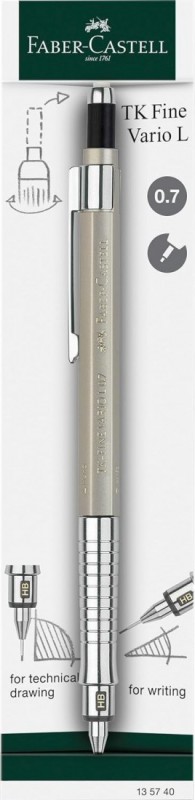 The TK-Fine Vario L mechanical pencil is ideal for writing and precise drawing. It has a soft/hard mechanism. In the soft position, the lead is spring-loaded for writing. In the hard position, the lead is rigid for precise drawing with the ruler. The mechanical pencil has a metal grip with a lead hardness indicator on the tip. The PVC-free extendable eraser is extra long. The mechanical pencil comes with 3 super polymer leads in lead hardness grade HB. The lead can of course be completely sinked. Other leads in different degrees of hardness are available separately.