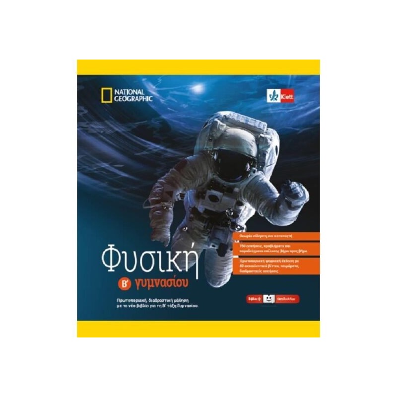 ΓΝΩΡΙΣΤΕ ΚΑΙ ΠΡΟΤΕΙΝΕΤΕ ΤΟ ΝΕΟ ΒΙΒΛΙΟ ΦΥΣΙΚΗΣ Β’ ΓΥΜΝΑΣΙΟΥ ΠΟΥ ΑΠΟΓΕΙΩΝΕΙ ΤΙΣ ΕΠΙΔΟΣΕΙΣ! Εκατοντάδες φυσικοί αξιολόγησαν και χρησιμοποίησαν δείγμα του βιβλίου στην τάξη. Τα αποτελέσματα ήταν εντυπωσιακά: οι μαθητές εντυπωσιάστηκαν και το μάθημα απογειώθηκε! Για πρώτη φορά οι μαθητές θα μπορούν να μελετούν Φυσική εύκολα και απολαυστικά, είτε στην τάξη ή στο σπίτι μόνοι ή με τους γονείς τους. Η Klett-National Geographic δίνει νέο νόημα στον όρο «βοήθημα». ΓΙΑΤΙ ΞΕΧΩΡΙΖΕΙ: Υψηλών προδιαγραφών έντυπο και ψηφιακό υλικό με την υπογραφή του κορυφαίου οργανισμού National Geographic - ένα πολύτιμο εργαλείο για τον μαθητή. Επιτρέπει στον μαθητή να μελετά το μάθημα μόνος του, χάρη στην εύληπτη παρουσίαση της θεωρίας και την αναλυτική καθοδήγηση για την επίλυση ασκήσεων. Δίνει πρόσβαση σε πλούσιο πολυμεσικό υλικό από όλες τις συσκευές με σύνδεση στο διαδίκτυο (εκπαιδευτικά βίντεο, βίντεο-πειράματα, 2D/3D προσομοιώσεις και διαδραστικές ασκήσεις με δυνατότητα εμφάνισης και ελέγχου των απαντήσεων για εύκολη αυτοαξιολόγηση). Στηρίζει τους μαθητές με μαθησιακές δυσκολίες χάρη στις ειδικές λειτουργίες του ψηφιακού βιβλίου (δυνατότητα επιλογής ειδικής γραμματοσειράς, ηχογραφημένη θεωρία). Προσφέρει εξατομικευμένη μάθηση με τη βοήθεια της LMS εφαρμογής Klett Book-App. Ο καθηγητής δημιουργεί μια ψηφιακή τάξη, αλληλεπιδρά με τους μαθητές του και ανατροφοδοτεί τον καθένα ξεχωριστά, προσαρμόζοντας τη διδασκαλία του εύκολα και αποτελεσματικά. Περιέχει τις λύσεις των ασκήσεων του σχολικού βιβλίου. Βιβλίο μαθητή (304 σελίδες) που περιλαμβάνει: • Όλη την ύλη της Β΄ Γυμνασίου, σύμφωνα με το επίσημο πρόγραμμα σπουδών του Υπουργείου Παιδείας, • Εύληπτη παρουσίαση της θεωρίας με παραδείγματα από την καθημερινότητα, • 600 ασκήσεις και πειράματα. Βιβλίο ασκήσεων (88 σελίδες) που περιλαμβάνει: •Πρόσθετες ασκήσεις για εμπέδωση της ύλης και πρακτική εφαρμογή της θεωρίας και μεθοδολογίας, •Λύσεις των ασκήσεων του σχολικού εγχειριδίου για έλεγχο και αυτοαξιολόγηση.
