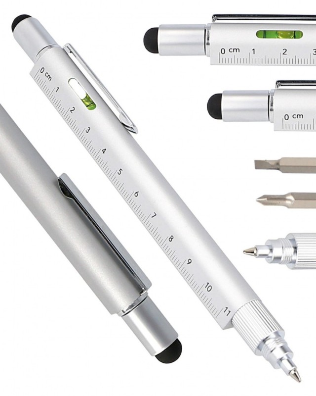 FOR CRAFTSMEN, BASHWORKERS & SCREWWORKERS: In addition to the document-proof standard large capacity refill in blue, this cool gadget has a touch pen function, a spirit level, a Phillips and slotted screwdriver and a tape measure.