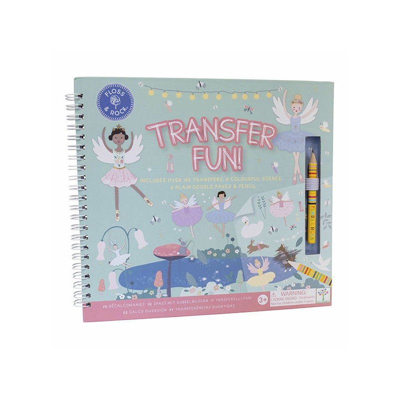 There\'s so much fun to be had with Transfers! This Enchanted Transfer Fun comes with over 150 brilliant enchanted themed transfers, 6 colourful scenes to place them onto, 6 plain pages for freestyle doodling and a pencil. Open the spiral bound book to find all your transfers neatly stored in the \'My Transfers\' pocket, find your chosen illustration and flick through the pages to find the perfect scene to put them onto. Scratch over the top of the drawing with the Floss & Rock pencil provided and lift up the sheet, like MAGIC you\'ll find them transferred onto the page. Spend many happy hours sparking creativity and making beautiful pictures with ballet dancers, castles, cute woodland friends and more.