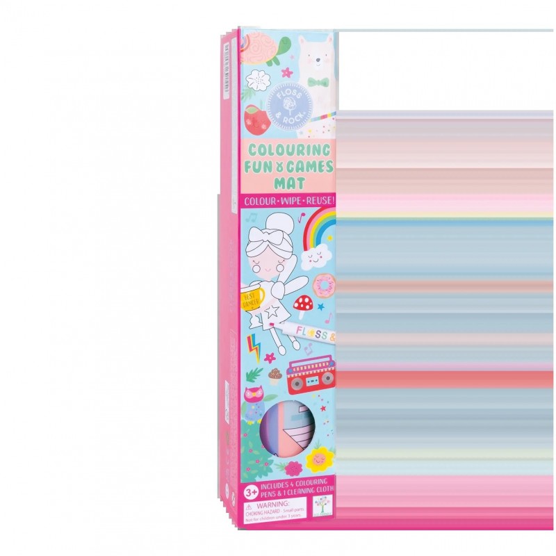 COLOUR. WIPE. REUSE. Our brand new Colouring Fun & Games Mat is a brilliant multi-play activity for travel. Simply roll out the mat for colouring, dot-to-dot, a maze and ‘tic tac toe’ games. When finished, wipe clean, roll up and use the fastening band to pack the mat away in the handy box to use over and over again! Our Rainbow Fairy design contains illustrations of fairy friends, funny animals and more. The mat includes 4 colour dry wipe pens, a handy cleaning cloth, fastener band and a reusable storage box.