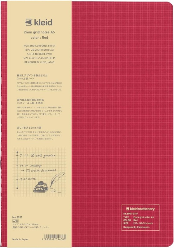 kleid 8909 Notebook, 2 mm Grid, A5 Square red, 64 ivoire pages,