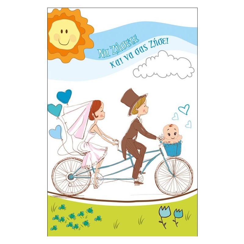 Στο εσωτερικό της κάρτας αναγράφεται : Για το ζευγάρι και το υπέροχο αγοράκι με τις καλύτερες ευχές!