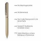 The mini ballpen fits perfectly into every wallet and into the smallest bag. This twist ballpen is equipped with a metal clip and a D1 standard black refill.
