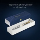 The satin stainless steel barrel is enhanced by brilliant gold-plated accents, offering a warm and sophisticated contrast that elevates its modern design. The balanced construction and ergonomic profile ensure a comfortable grip and precise control, even during extended writing sessions.