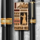 The fountain pen is made of special resin hand-turned from solid bar, hand-polished to a mirror-like surface; the black/orange duotone is a reference to the valuable "black-figure ceramics" of ancient Greece; the clip, a very characterizing element, is obtained by "lost wax" casting in compliance with the ancient artisan tradition of goldsmith art; the pen body engraved with vertical lines recalls the grooves of the ancient columns of the Parthenon; the band on the cap and the nib are enriched with engravings that recall the ornamental decorations typically of Greek origin; window for checking the ink level; 24-carat gold-plated metal parts.