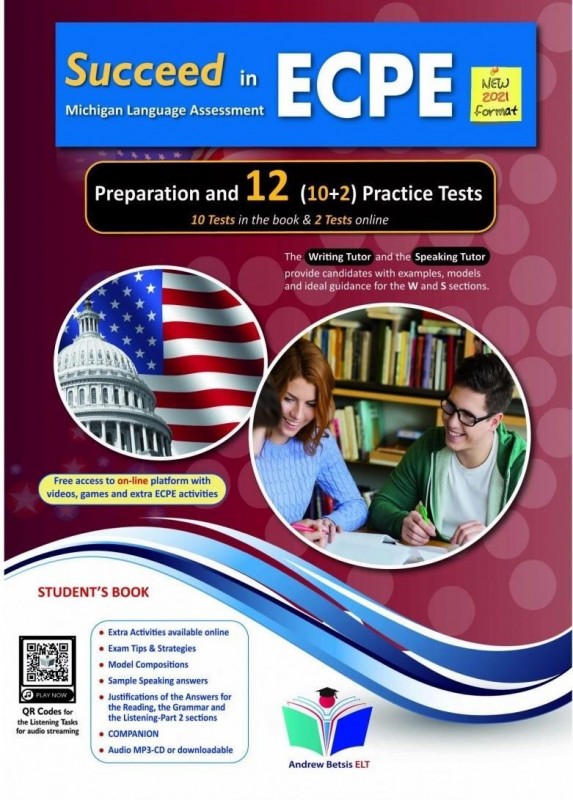 Key Features: ? 12 complete Practice Tests for the 2021 Michigan ECPE exam ? QR Codes for each part of the Listening paper, for easy audio streaming in smartphones & tablets. ? Exam Tips & Strategies for each task ? Writing Tutor with Model Answers, Writing Plan, Useful Vocabulary & Exam Tips for each Writing Task (Email & Essay) ? Speaking Tutor with Model answers, Useful Vocabulary and Exam tips for the Speaking section ? Justifications of the answers for the Reading, Grammar & the ListeningPart 2 sections ? Companion with the Vocabulary words and extra activities Free access to on-line platform with videos, games and extra ECPE activities