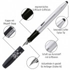 SWITCH- the innovative fountain pen with the App made of extraordinary quality, is equipped with a comfortable ergonomic grip part for classic writing on paper and a nib A with 5 years guarantee. This fountain pen impresses with ist extraordinary soft and comfortable writing experience and ist light weight which is perfectly suitable for continuous writing in everyday school life. The SWITCH fountain pen is as well equipped with a stylus tip which glides lightly and conductively over capacitive screens of smart phones and tablet PCs. The special designed grip ensures a simple handling. Consequently the SWITCH can be used perfectly as a fountain pen for beginners. Made of conductive plastic, the SWITCH serves as a multifunctional writing instrument in school and is suitable for every age group. But the SWITCH can do more: It’s the first pen with a free App for writing exercises on tablets. ONLINE developed together with teachers this App for writing, letter and word exercises.