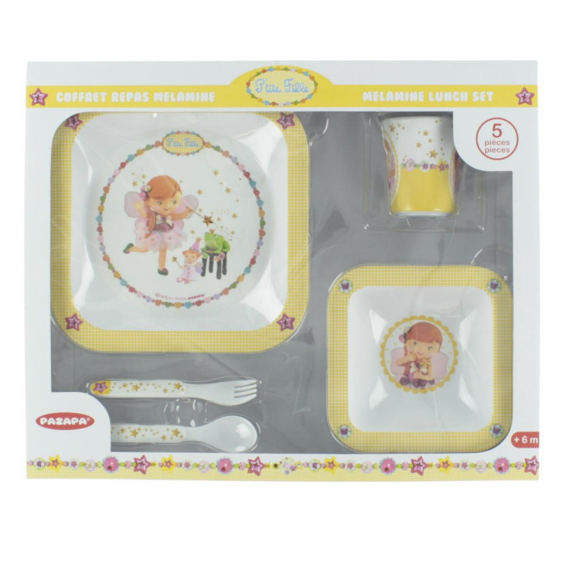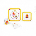 Το σετ περιλαμβάνει 1 πιάτο (21.7 x 217 x 2,3 εκατοστά), 1 μπολ (15,6 x 15,6 x 4 cm), 1 κούπα (7 x 8 cm) 1 κουτάλι της σούπας και 1 πιρούνι.