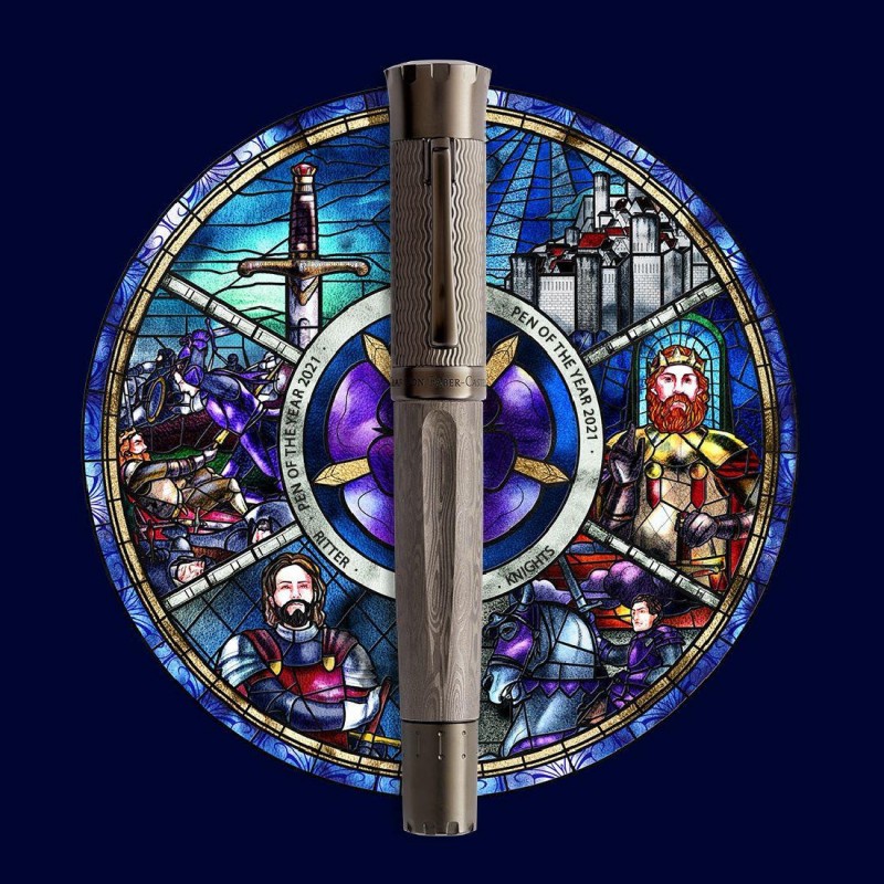The Pen of the Year 2021 is inspired by medieval knights, their heroes, myths and legends. In those days, the strongest prevailed, therefore skilful sword fighting and the nature of his weapons played a central role in a knight’s life. To forge the knightly swords medieval smiths used Damascus steel, which was regarded as particularly hard while being flexible. Its extraordinary properties are achieved through repeated welding and folding of different types of steel, which also produces the typical iridescent surface. It is thanks to this feature that every one of the 375 fountain pens in this limited Pen of the Year edition is truly unique.