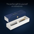 Waterman Impression Stainless Steel GT Fountain Pen – ένα εκλεπτυσμένο όργανο γραφής που συνδυάζει σύγχρονη αισθητική με διαχρονική κομψότητα. Το σατινέ φινίρισμα από ανοξείδωτο ατσάλι αναδεικνύεται μοναδικά μέσα από τις επιχρυσωμένες λεπτομέρειες (Gold Trim), δημιουργώντας ένα ισορροπημένο και κομψό αποτέλεσμα.