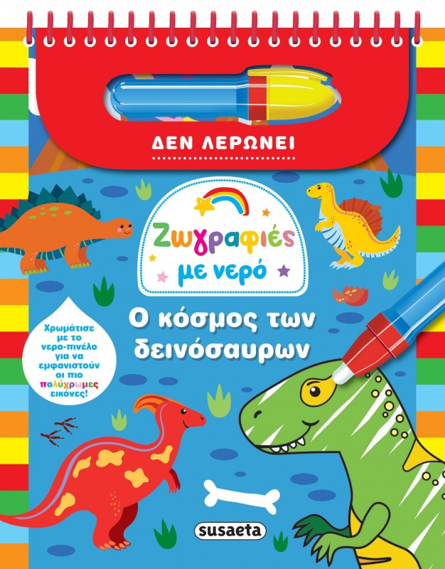 Ανακάλυψε τον μαγικό κόσμο των χρωμάτων με το νερο-πινέλο! Γέμισε το πινέλο σου με νερό και άρχισε να χρωματίζεις τις σελίδες του βιβλίου! Θα δεις όλο τον κόσμο των δεινόσαυρων να ζωντανεύει μπροστά σου! Μόλις στεγνώσουν οι σελίδες, το χρώμα θα εξαφανιστεί και τότε μπορείς να τις χρωματίσεις ξανά και ξανά, όσες φορές θέλεις!