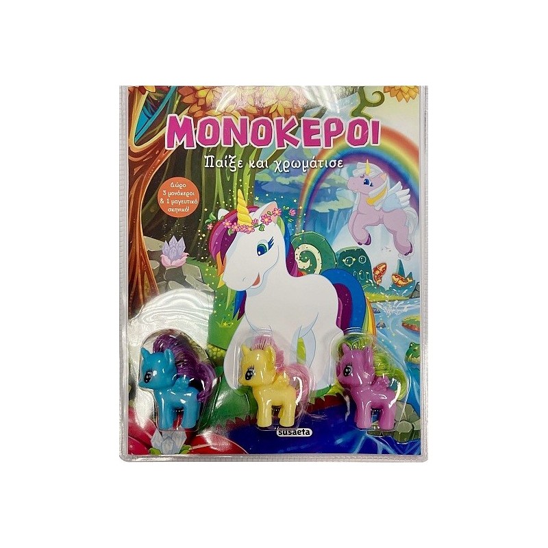 Χρωμάτισε τους όμορφους μονόκερους που θα βρεις στο βιβλίο και παίξε με τα τρία κουκλάκια μονοκεράκια δημιουργώντας τις δικές σου ιστορίες με φόντο το μεγάλο σκηνικό του μαγικού δάσους!