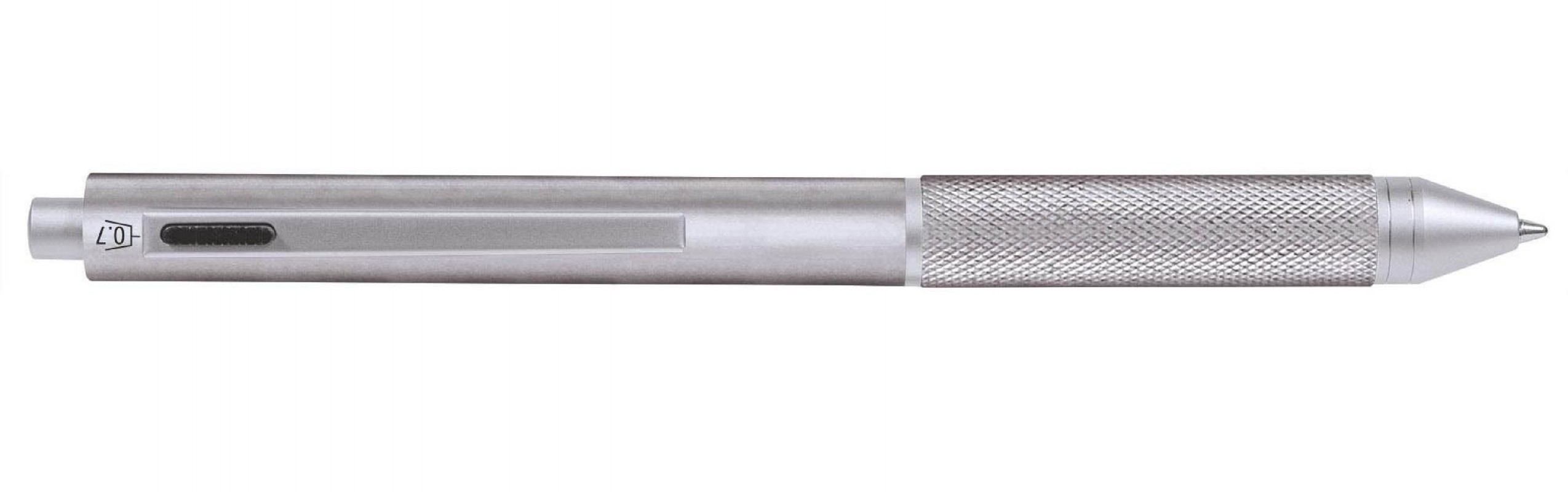 The 4–in-1 pen is made of metal, a multifunctional ballpen with blue, red and black D1 standard refills, mechanical pencil 0.7 mm and eraser.