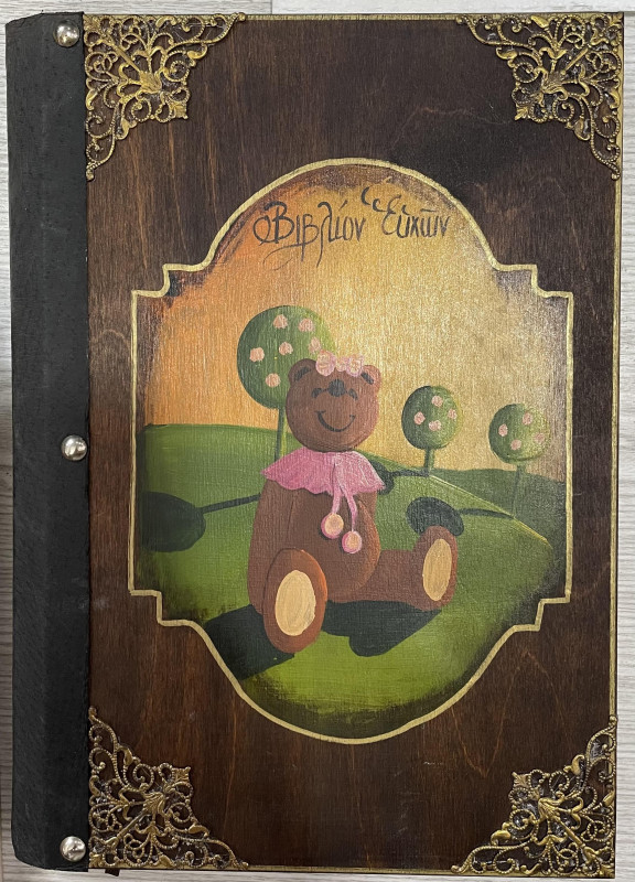 Βιβλίο ευχών με παράσταση αρκουδάκι, με ξύλινο εξώφυλλο, υφασμάτινο σελιδοδείκτη και δερμάτινη ράχη.