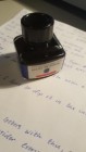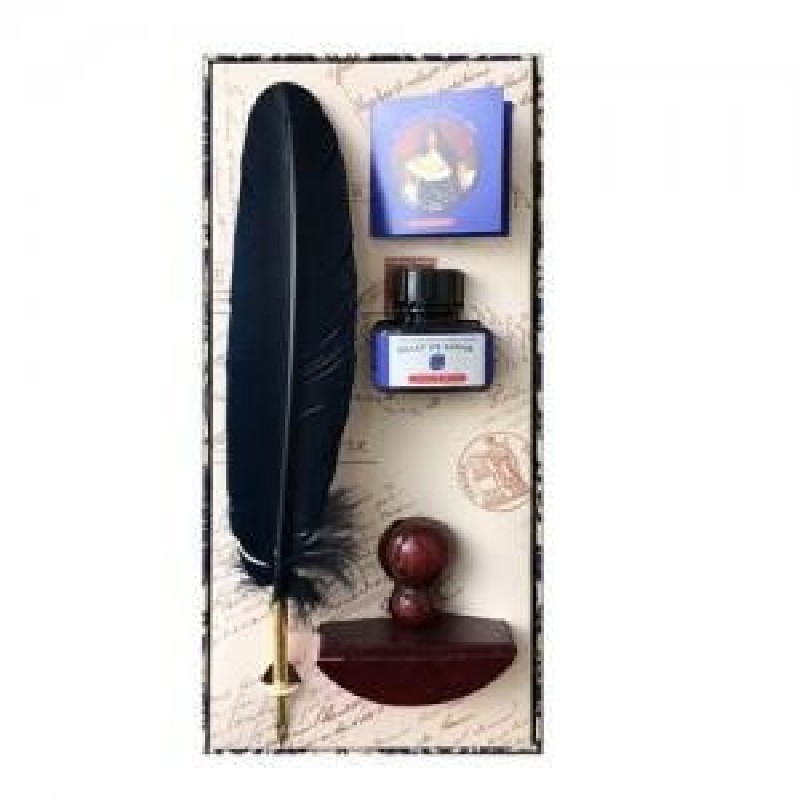 Contains a feather with gold plated finish, 30ml Eclat de Saphir ink in a glass bottle and a wooden handle with blotting paper.