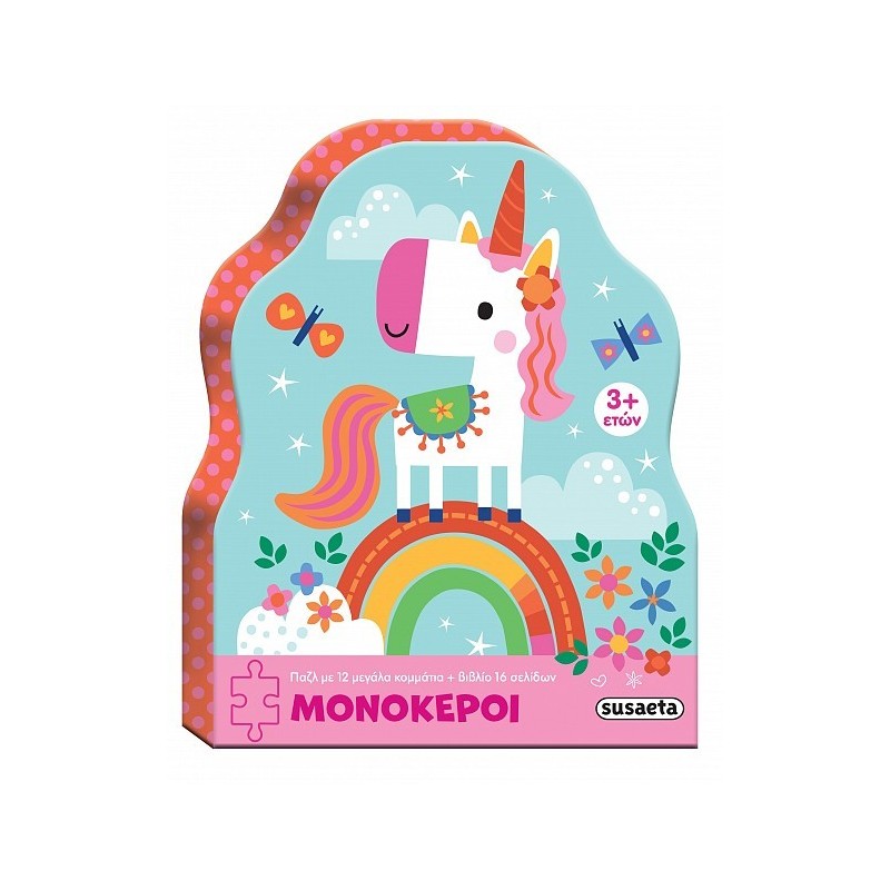 Μονόκεροι σε παζλ! Μέσα σε αυτό το κουτί θα βρεις 12 µεγάλα κοµµάτια παζλ και ένα βιβλίο γεµάτο γλυκούς µονόκερους σε όλα τα χρώµατα!