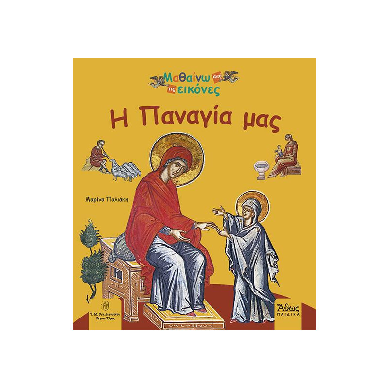 Τα παιδιά μαθαίνουν τη ζωή της Παναγίας μας, μέσα από τις πανέμορφες αγιογραφίες του Τζώρτζη, που βρίσκονται στο καθολικό της Ι.Μ. Διονυσίου Αγίου Όρους. Ταυτόχρονα ξεκινούν ένα υπέροχο ταξίδι γνωριμίας με τη Βυζαντινή τέχνη. Μια τέχνη που είναι πολύ κοντά στην παιδική ψυχή, γιατί καταργεί τις σκιές, την προοπτική, τα χωρίσματα και τον χρόνο.