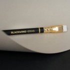 This Eras pencil features a matte black barrel with a gold stripe, gold ferrule, white eraser, and our soft graphite. Each pencil is stamped with a debossed horse emblem, a nod to the original 2010 design that reintroduced Blackwing to the world. Each box includes 12 special edition pencils.