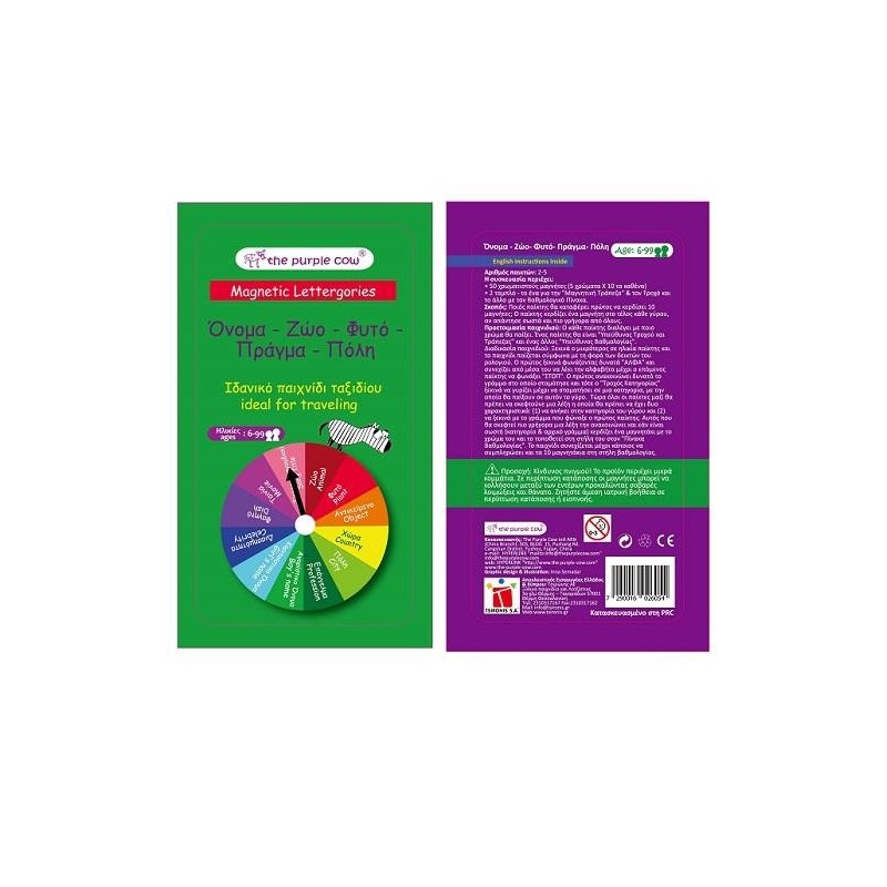 Το κλασσικό επιτραπέζιο Όνομα-Ζώο-Φυτό-Πράγμα-Πόλη σε μαγνητική μορφή και σε συσκευασία ταξιδίου. Βρείτε τη λέξη γρήγορα και βγείτε εσείς ο νικητής! Ένα παιχνίδι ταχύτητας και διασκέδασης για όλη την οικογένεια. Περιλαμβάνει 50 χρωματιστούς μαγνήτες (5 χρώματα x 10 το καθένα) 2 ταμπλό (μαγνητική τράπεζα – τροχός και βαθμολογικός πίνακας). Περιλαμβάνονται οδηγίες στα ελληνικά και στα αγγλικά. Ιδανικό για 2-5 παίκτες. Κατάλληλο από 6 ετών και άνω. Διαστάσεις συσκευασίας: 18,5x10,5x1 εκ.
